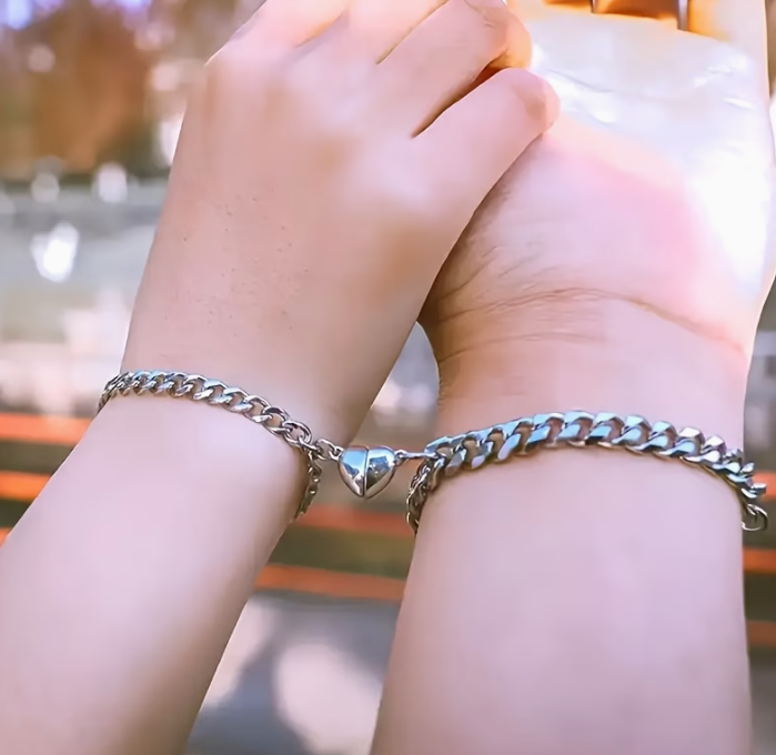 Conjunto de pulseras para pareja con un diseño especial de corazón magnético que se une cuando las manos se acercan.