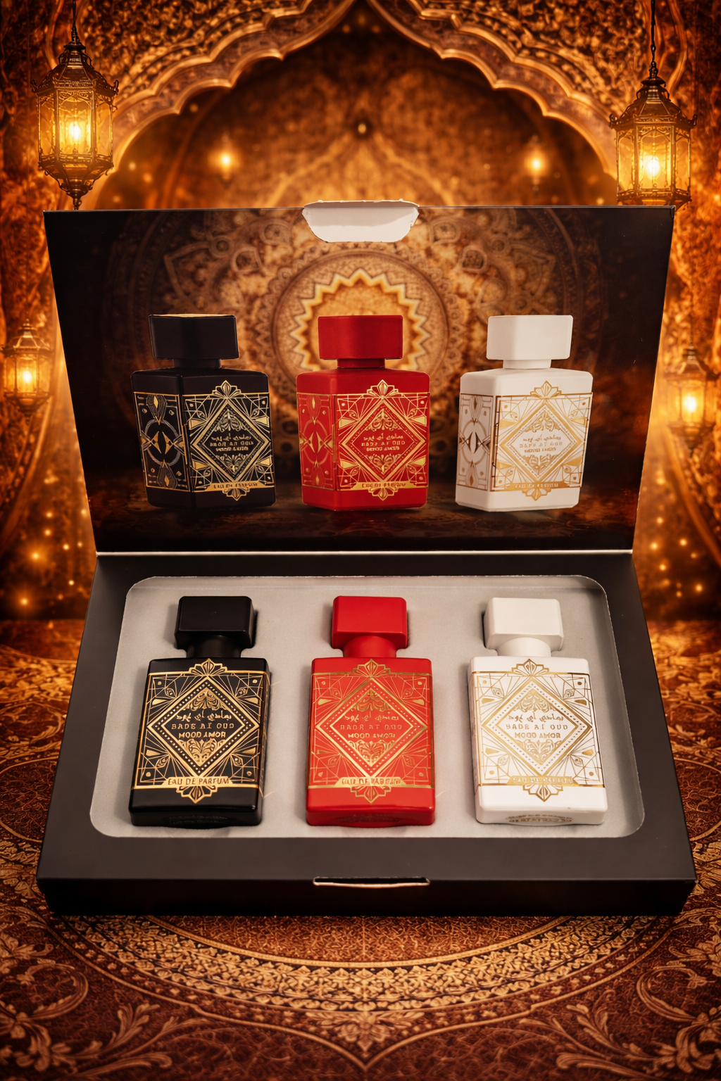 Descubre el set exclusivo Bade’e Al Oud – Mood Amor, una colección elegante de tres perfumes intensos y sofisticados inspirados en la perfumería oriental de lujo.