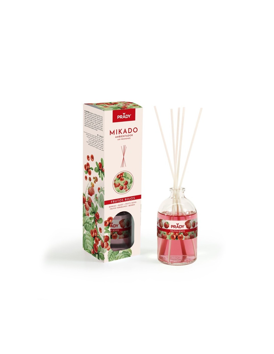 El ambientador Mikado Frutos Rojos perfuma el hogar con una fragancia dulce y afrutada, inspirada en la mezcla de frutos rojos maduros.
