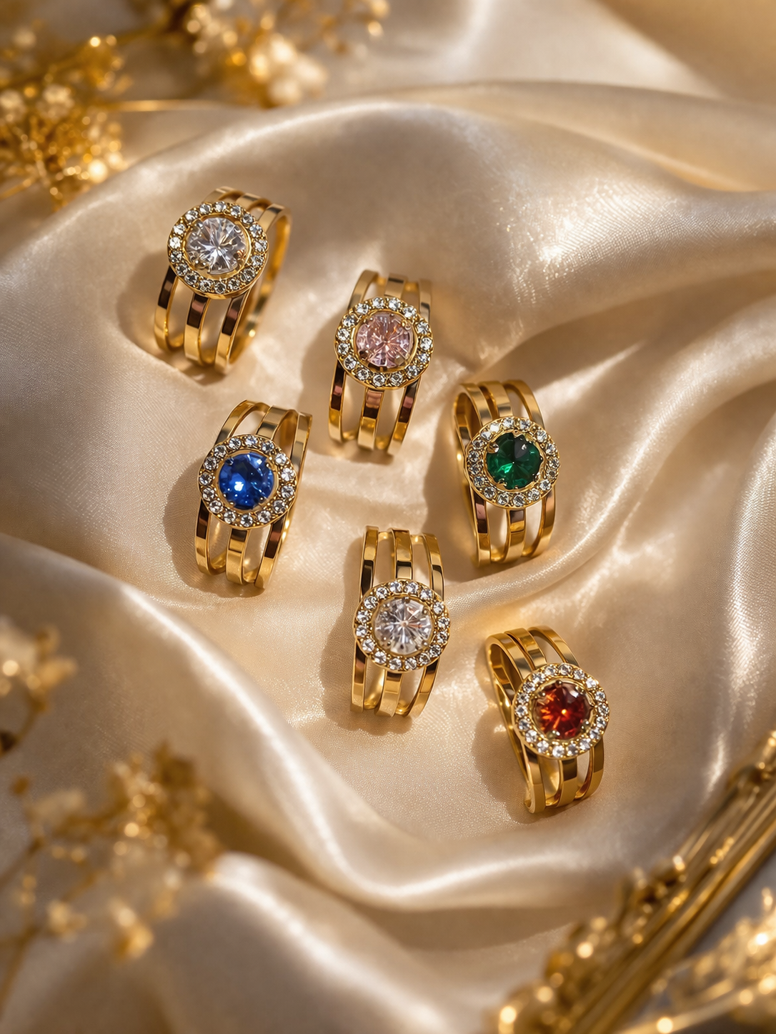 Su piedra central de color intenso, rodeada por un halo de circonitas brillantes, crea un efecto luminoso y refinado que capta todas las miradas. El diseño de triple aro aporta un toque moderno y exclusivo, ideal para quienes buscan destacar con un accesorio único 💫