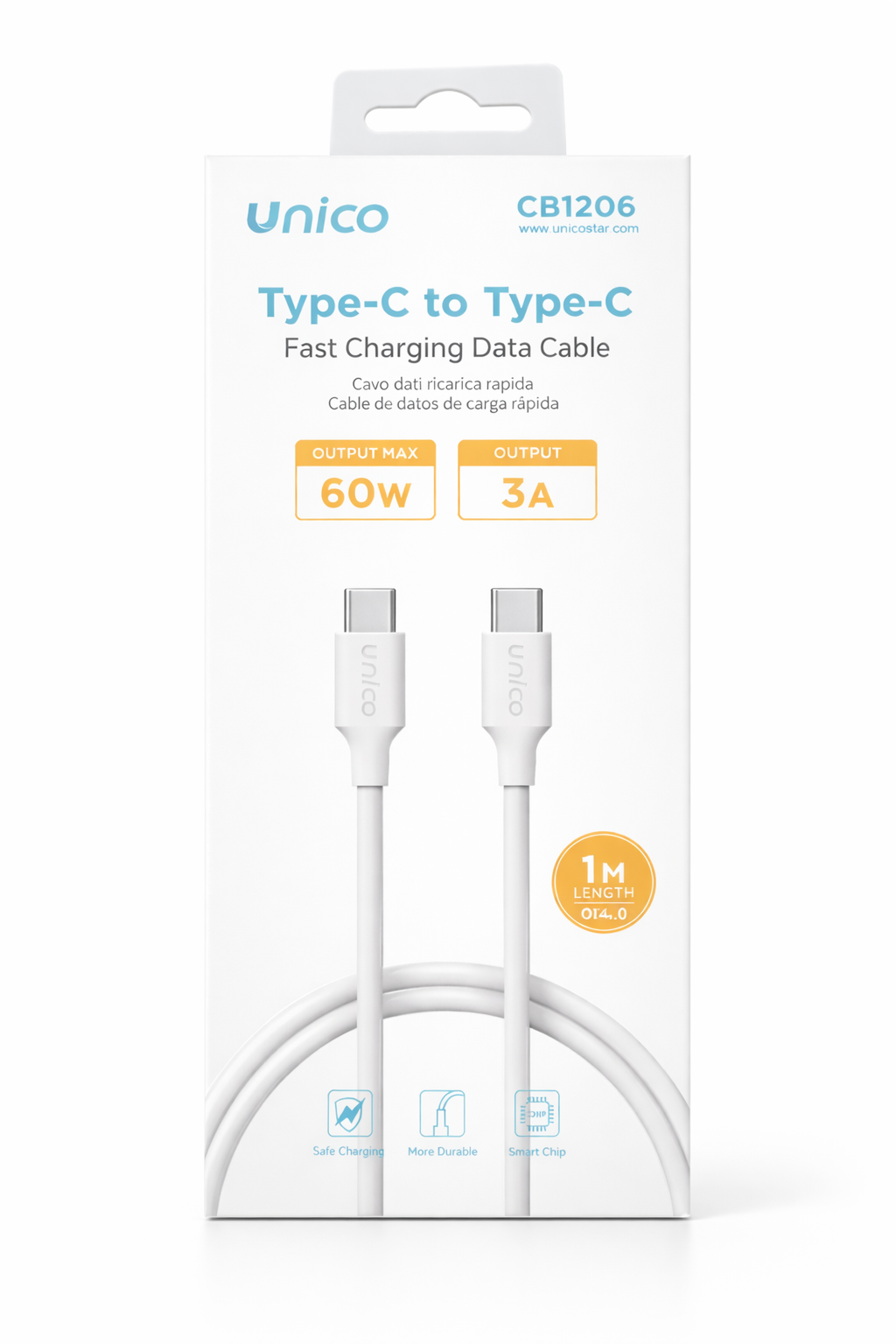 Cable USB Tipo C a Tipo C de la marca UNICO, diseñado para carga rápida de alta potencia y transferencia de datos. Ideal para el uso diario con smartphones, tablets, power banks y otros dispositivos compatibles con USB-C.