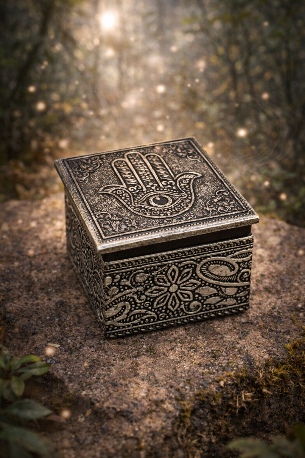 Esta caja decorativa de madera MDF con grabado de la Mano de Fátima es un pequeño detalle lleno de significado y simbolismo.