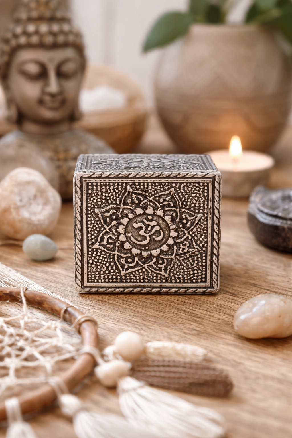 Esta caja decorativa de madera MDF con grabado del símbolo Om es un pequeño detalle lleno de significado.