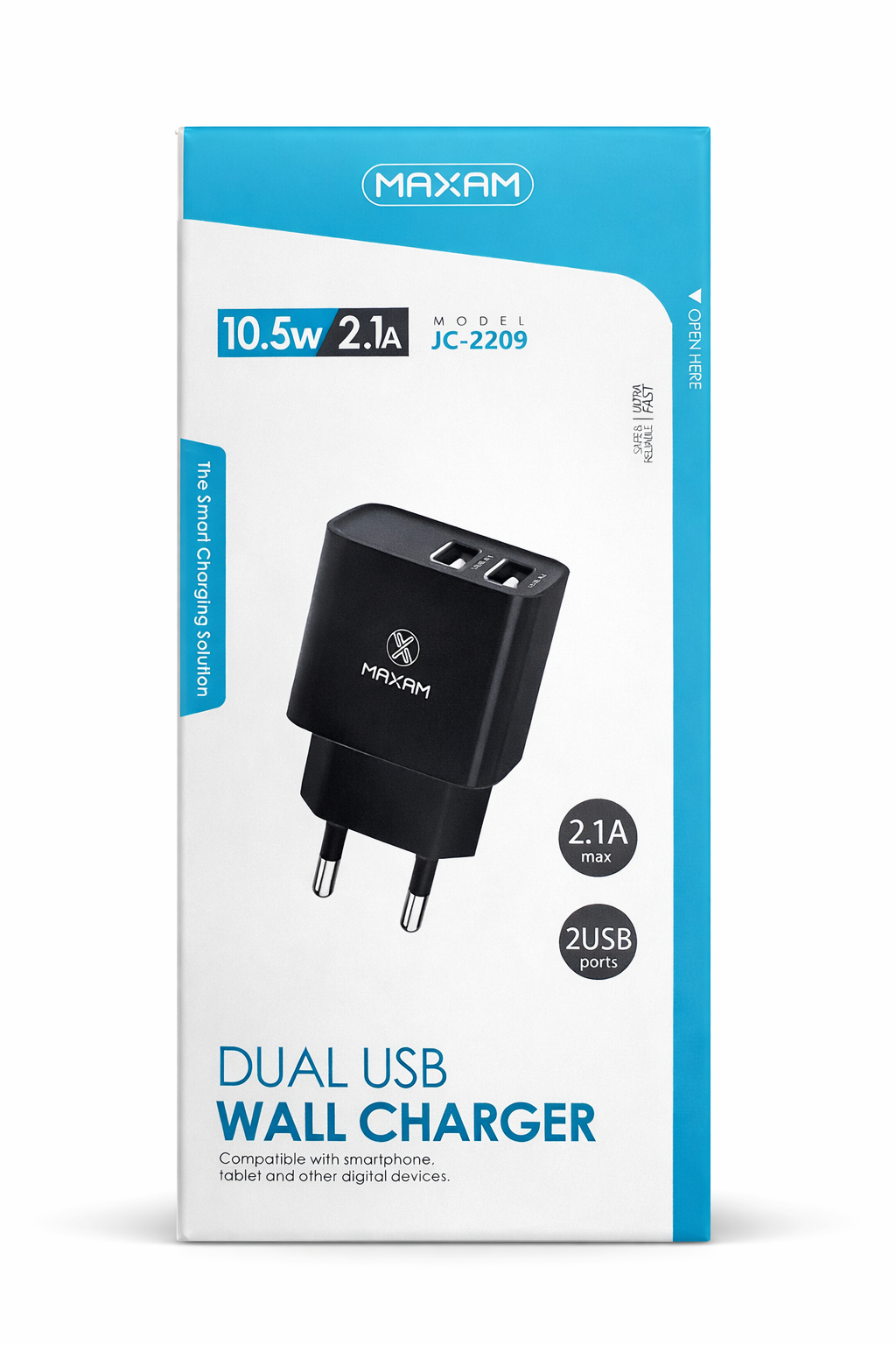 Cargador de pared MAXAM con doble puerto USB, diseñado para cargar smartphones, tablets y otros dispositivos electrónicos de forma segura y estable.