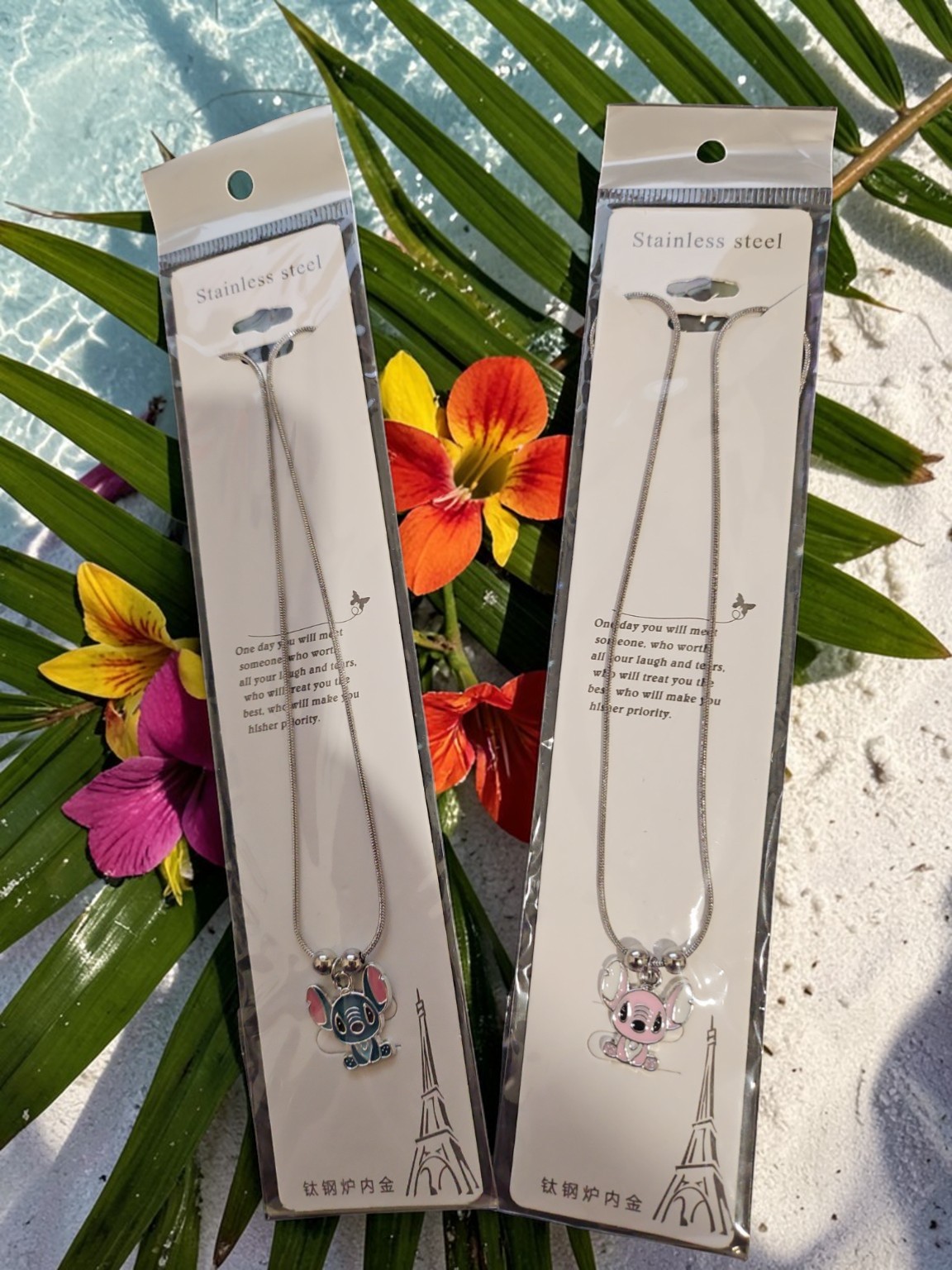 Añade un toque adorable y kawaii a tu estilo con este bonito collar inspirado en Stitch y Angel.
