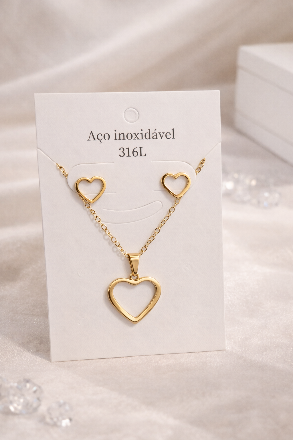 Descubre la elegancia del minimalismo con este set de collar y pendientes de corazón abierto en color dorado, diseñado en acero inoxidable 316L de alta calidad ✨