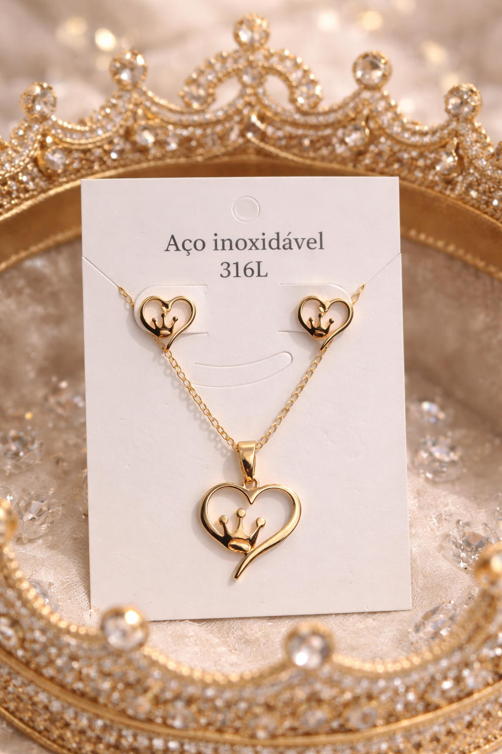 Destaca con este elegante set de collar y pendientes con corazón y corona en color dorado, fabricado en acero inoxidable 316L de alta calidad ✨