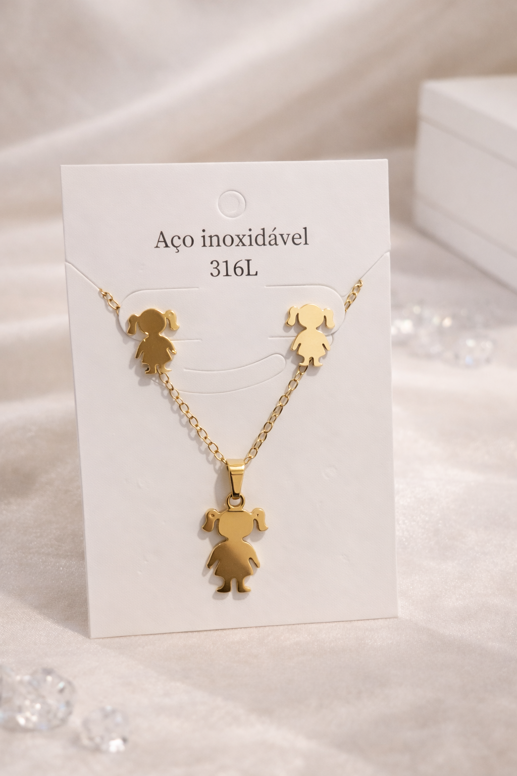 Expresa el amor más puro con este delicado set de collar y pendientes en forma de niña en color dorado, fabricado en acero inoxidable 316L de alta calidad ✨