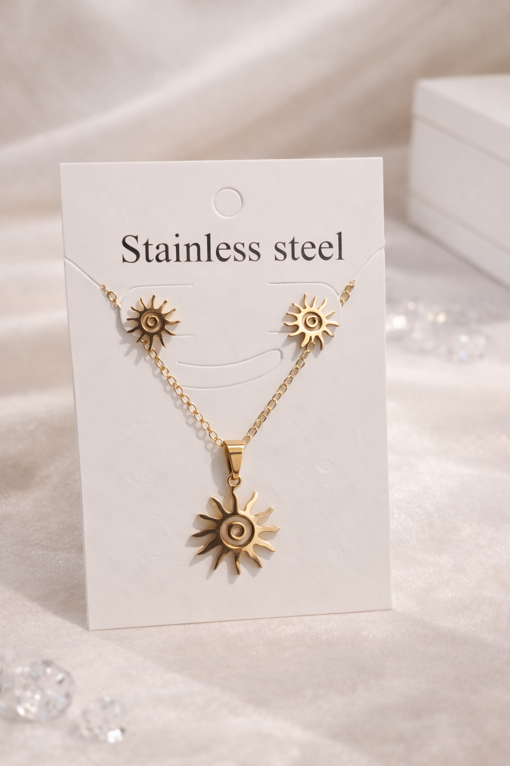 Ilumina tu estilo con este elegante set de collar y pendientes en forma de sol dorado, fabricado en acero inoxidable 316L de alta calidad ✨