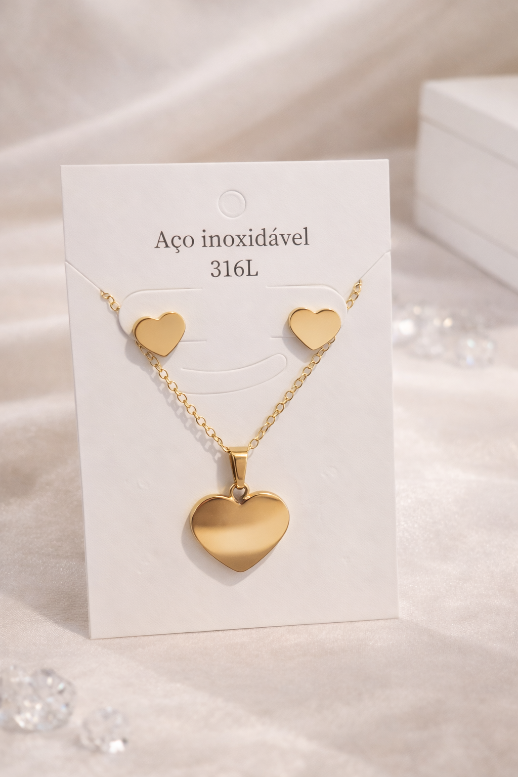 Este set incluye un collar con colgante de corazón y pendientes a juego, perfectos para complementar cualquier look, desde el día a día hasta ocasiones especiales.