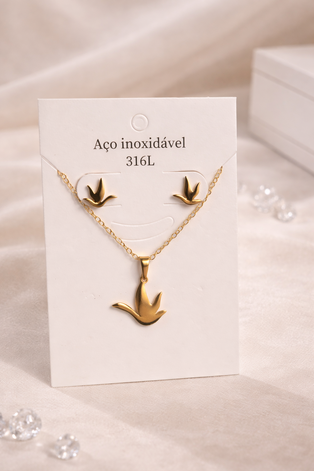Este elegante conjunto de joyería en acero inoxidable 316L dorado representa una delicada paloma en vuelo, símbolo de paz, amor y libertad 💖