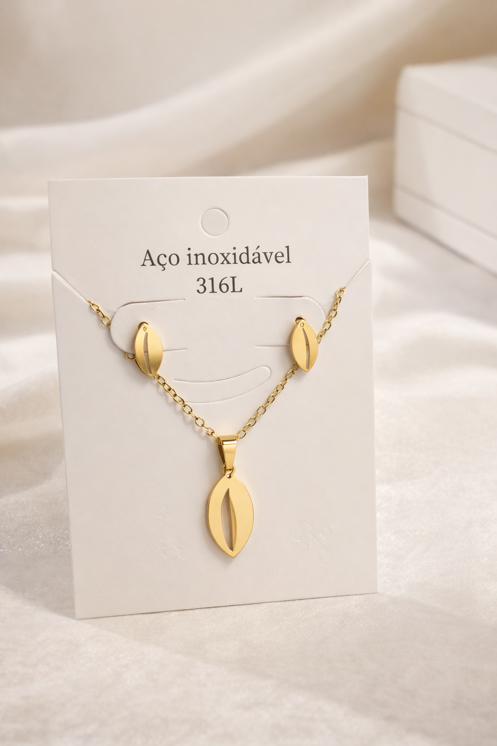 Compuesto por collar y pendientes a juego, este set combina minimalismo y estilo en una joya moderna y fácil de llevar en cualquier ocasión.