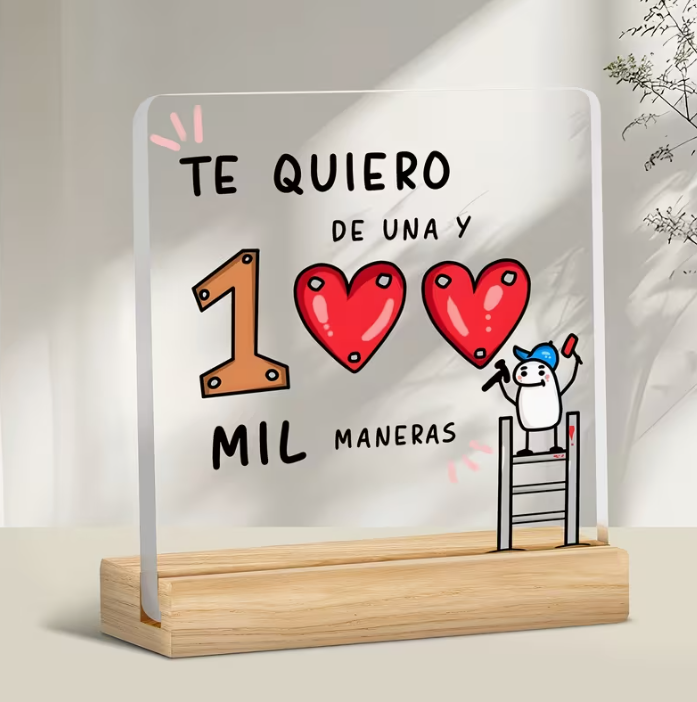 Esta decoración de metacrilato con base de madera transmite un mensaje lleno de amor: “Te quiero de una y mil maneras”.