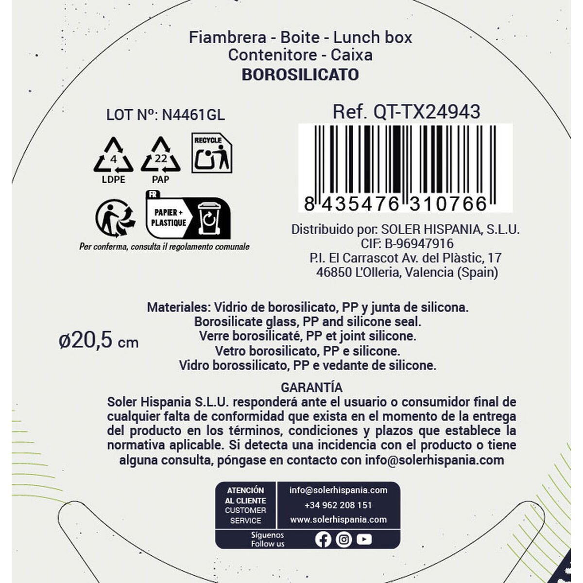 • Material: Vidrio de Borosilicato