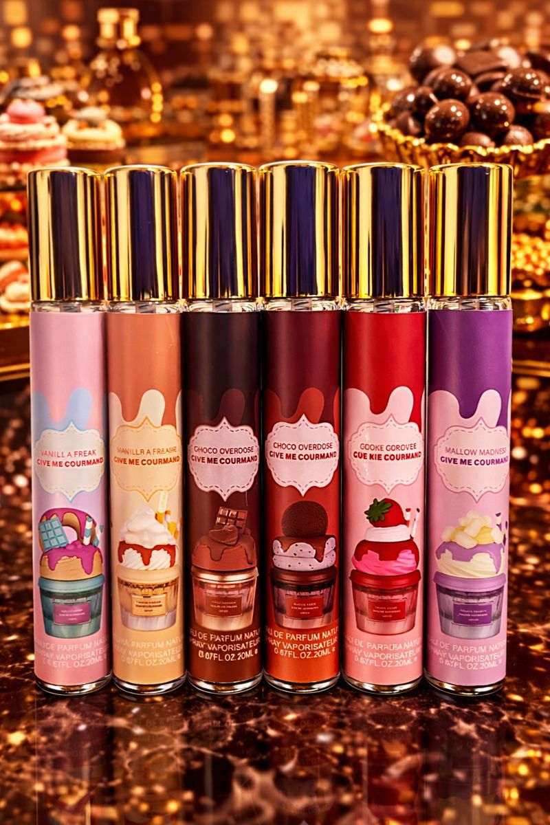 Este pack incluye 6 perfumes en spray de 20ml, inspirados en un universo dulce y gourmand. Cada fragancia ofrece una experiencia única, con notas irresistibles que evocan postres, vainilla, chocolate y frutas.