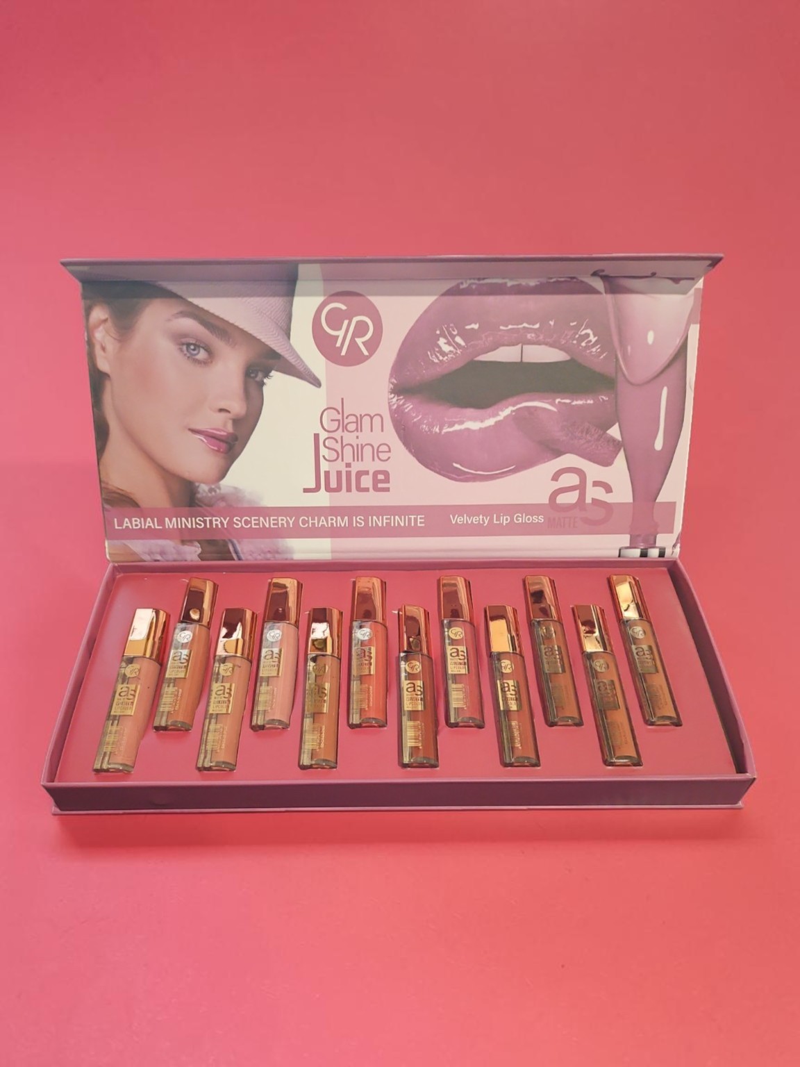Descubre el set completo de 12 gloss labiales Glam Shine Juice, ideal para todas las amantes del maquillaje 💋✨