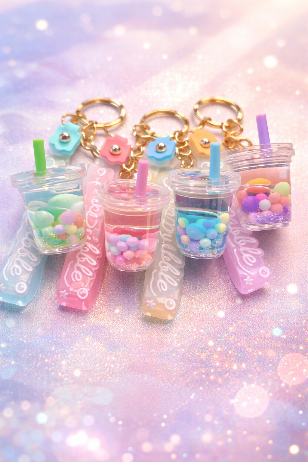 Este llavero tipo bubble tea destaca por su diseño único con pequeñas perlas de colores en su interior, creando un efecto llamativo y original.