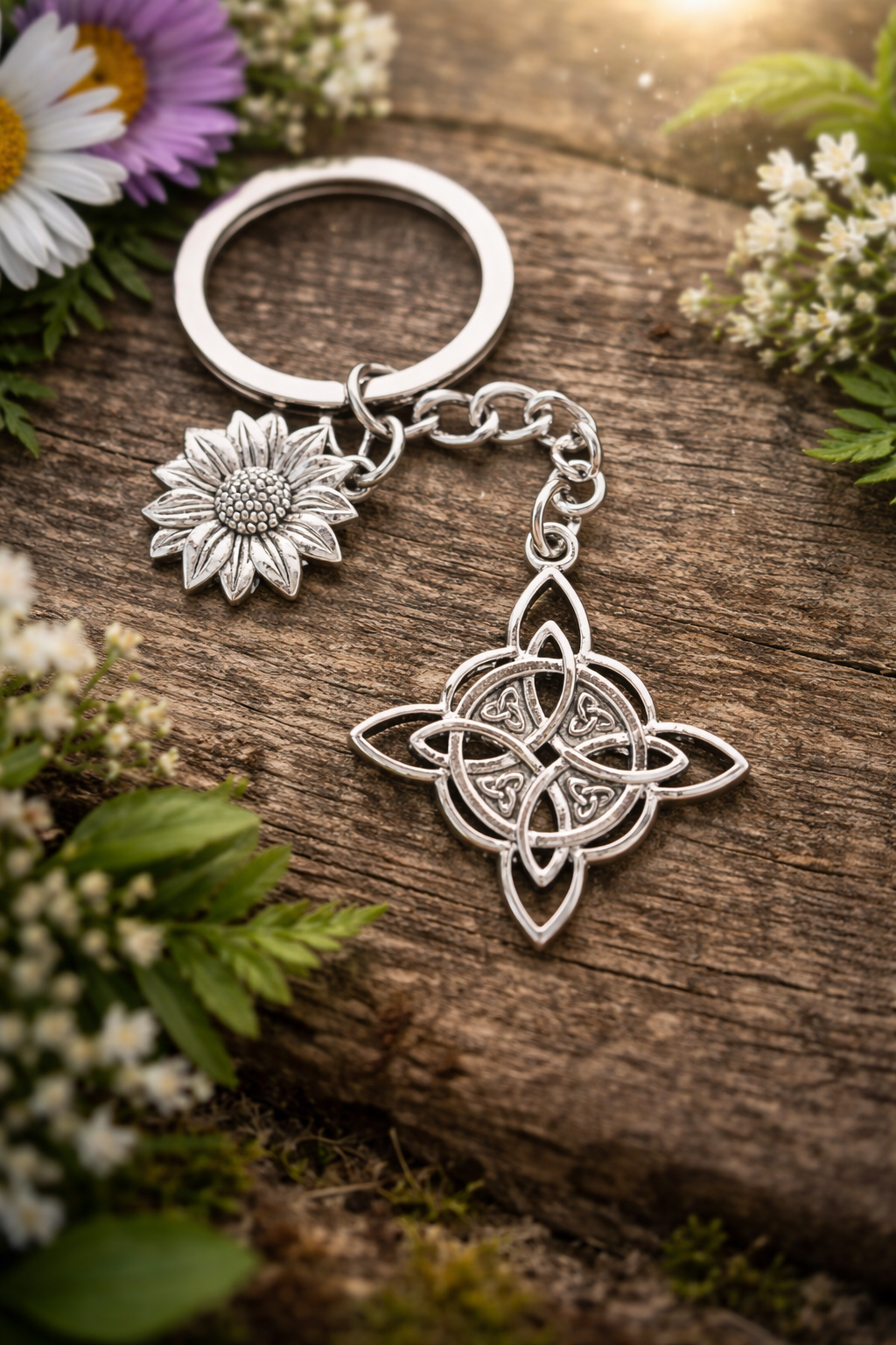 Este elegante llavero combina dos símbolos llenos de significado: una delicada flor 🌼 y un nudo celta 🍀, representando la naturaleza, la armonía y la buena suerte.