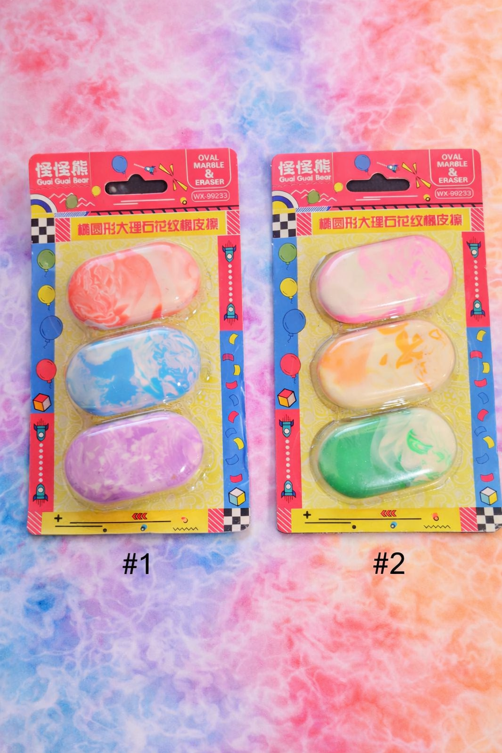 Pack de 3 gomas con efecto mármol, originales y coloridas, perfectas para el cole o pequeños detalles 🎒✨