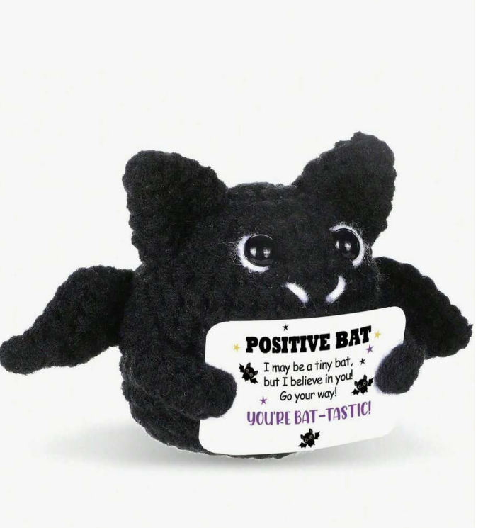 Este original murciélago de peluche 🦇 destaca por su diseño divertido y su mensaje inspirador “Positive Bat”, ideal para transmitir ánimo y confianza 💛