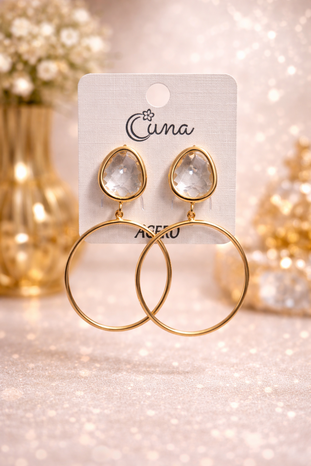 Pendientes elegantes y ligeros con cristal transparente facetado y aro dorado.