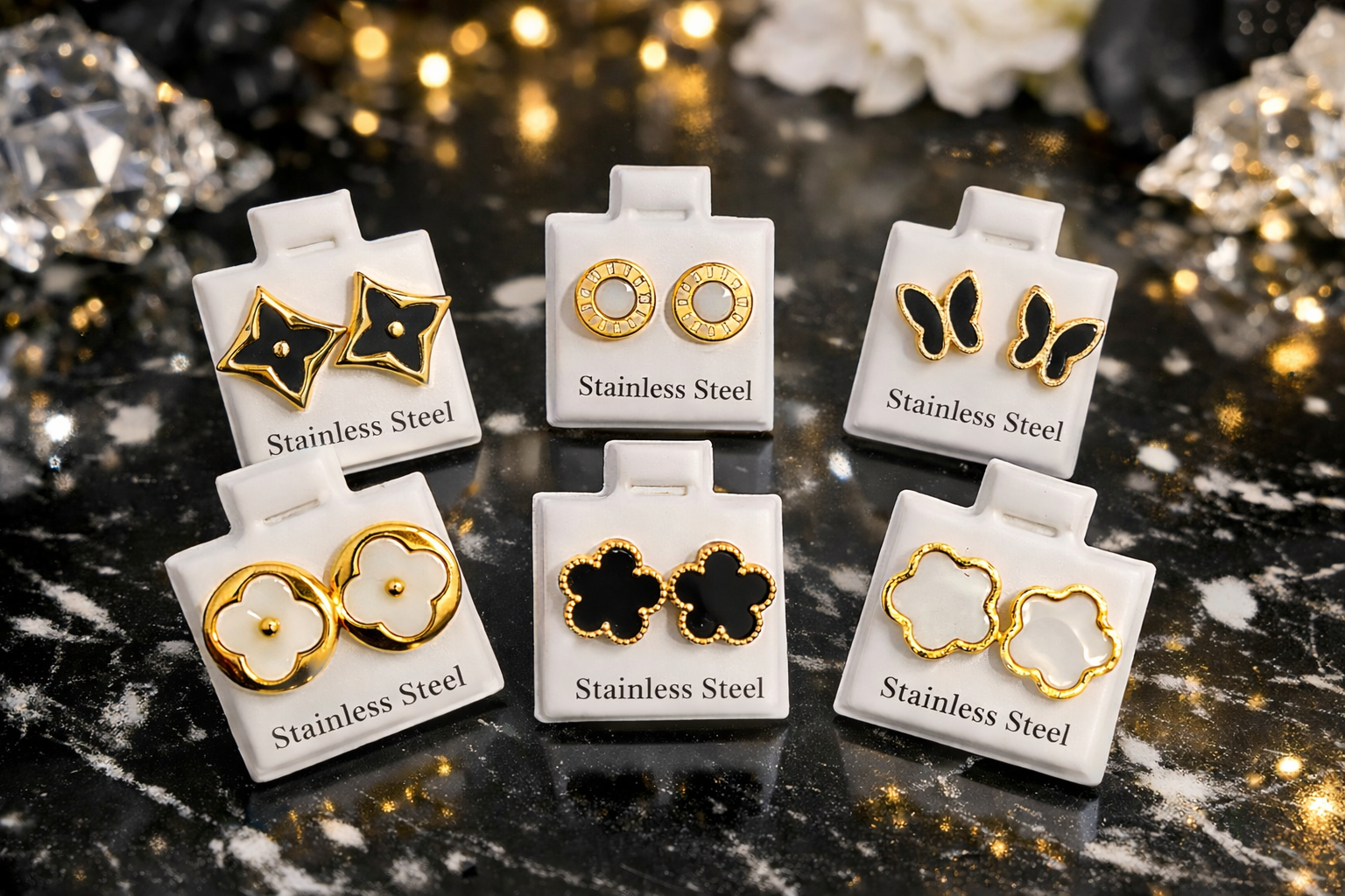 Descubre esta elegante colección de pendientes de acero inoxidable con acabados dorados y diseños modernos. Cada modelo combina delicadeza y estilo, ofreciendo diferentes formas como trébol, mariposa, círculo o estrella para adaptarse a todos los gustos.