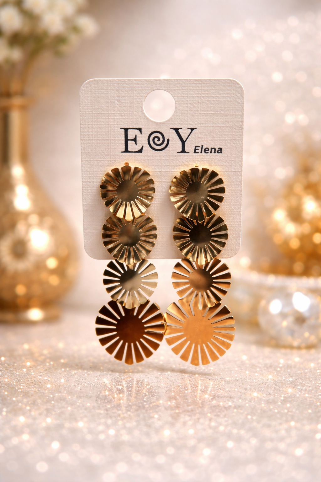 Su estructura en forma de flores geométricas superpuestas crea un efecto visual delicado y elegante que aporta movimiento y brillo al rostro. Fabricados en acero inoxidable, son resistentes, ligeros y cómodos para llevar durante todo el día.