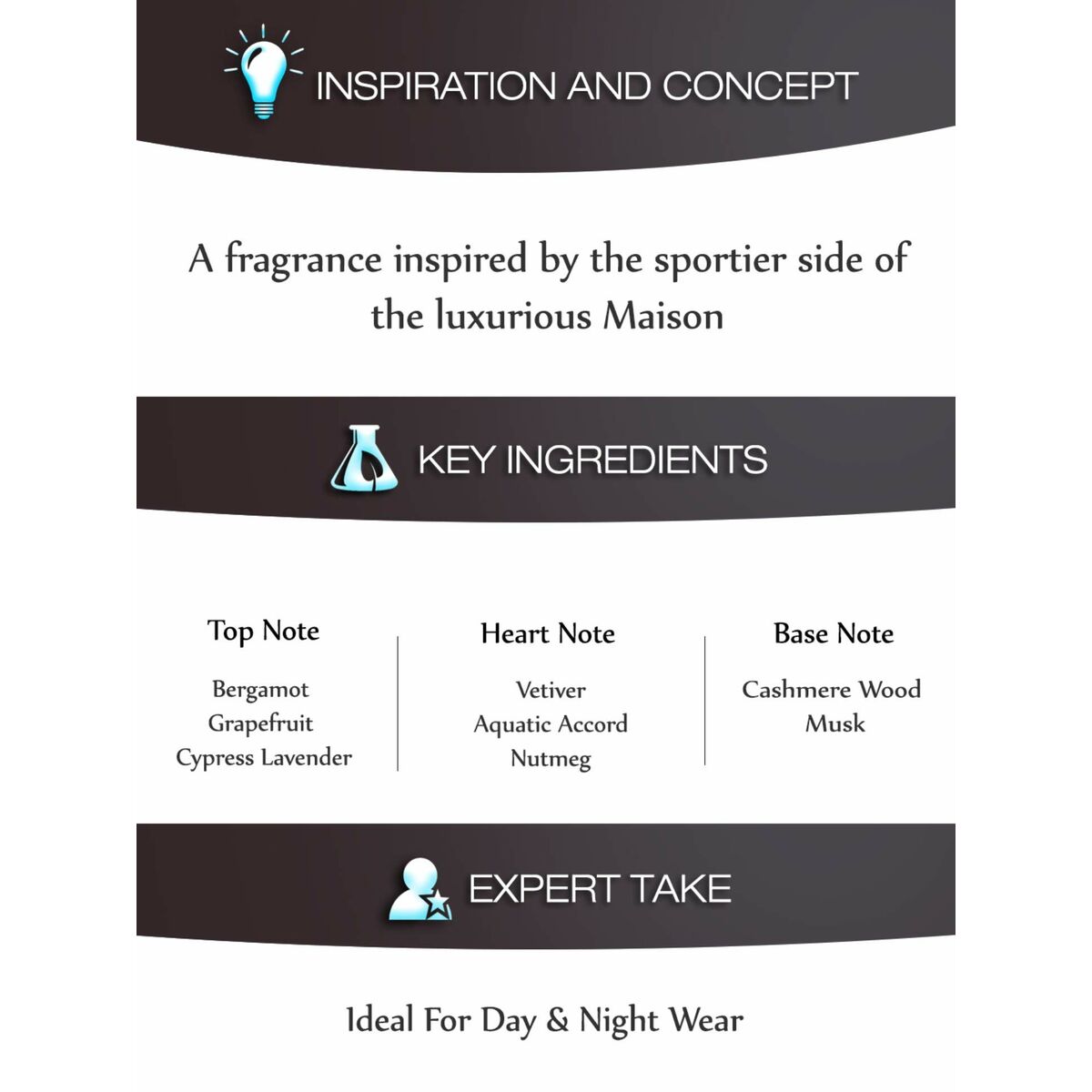 - Principales notas de fondo de la fragancia: Madera de cachemira, Musk o almizcle