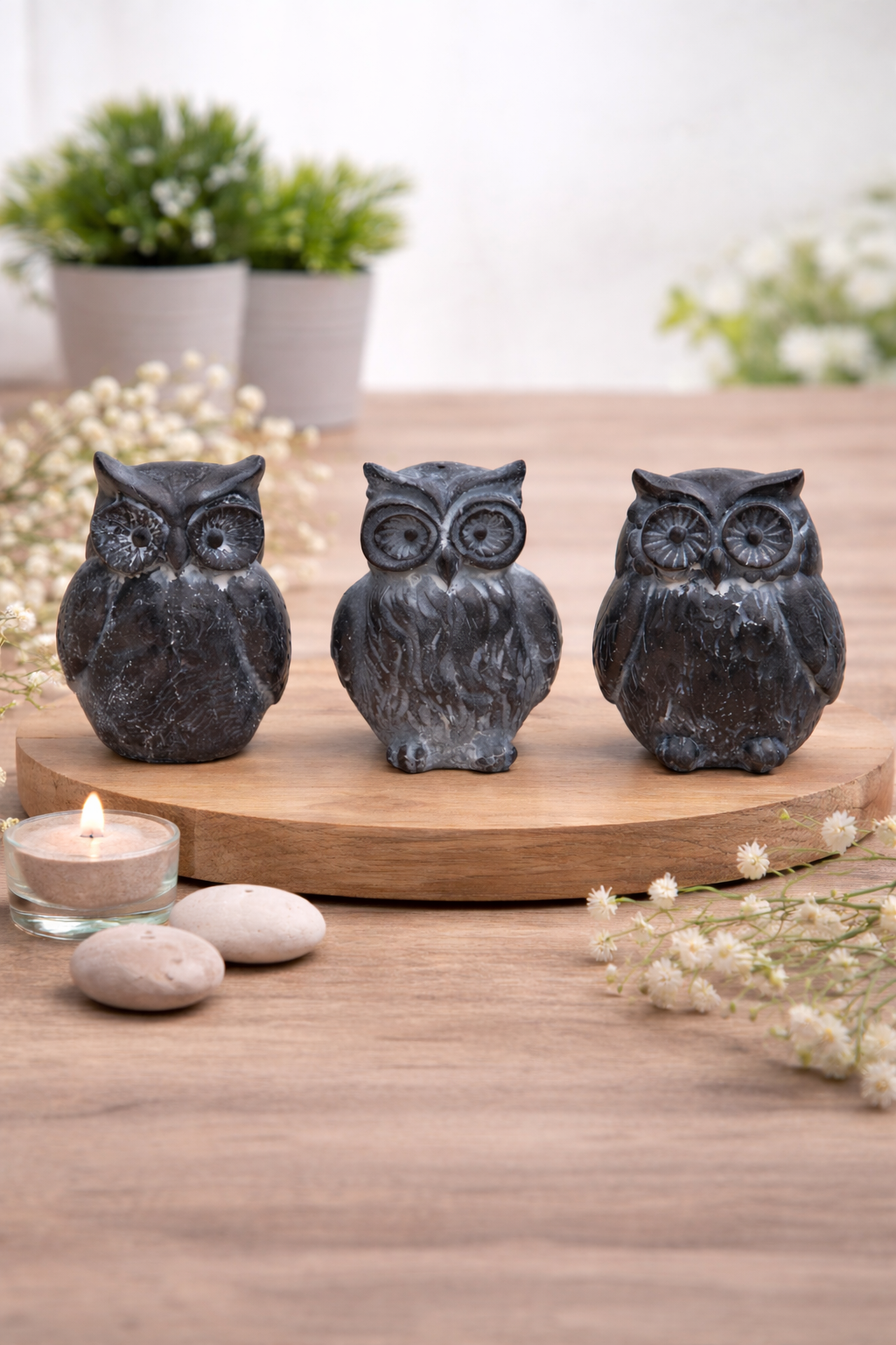 Aporta encanto y simbolismo a tu hogar con este set de 3 búhos decorativos.