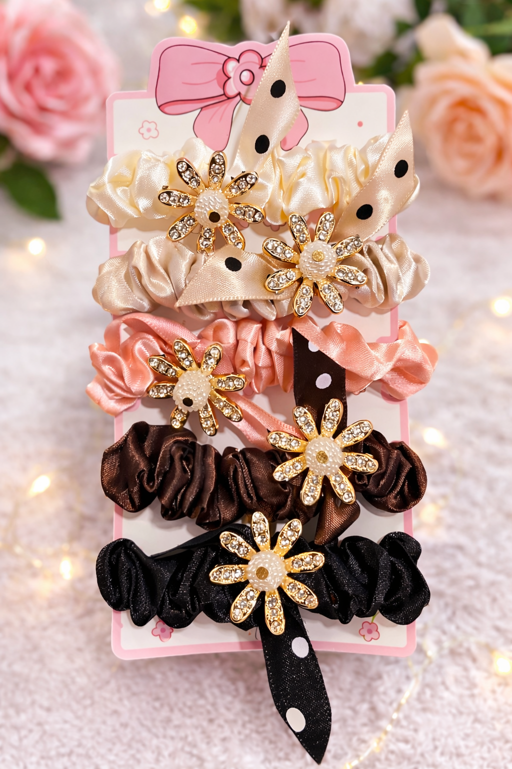 Elegante set de 5 coleteros satinados decorados con charm floral con pedrería y lazo con lunares.