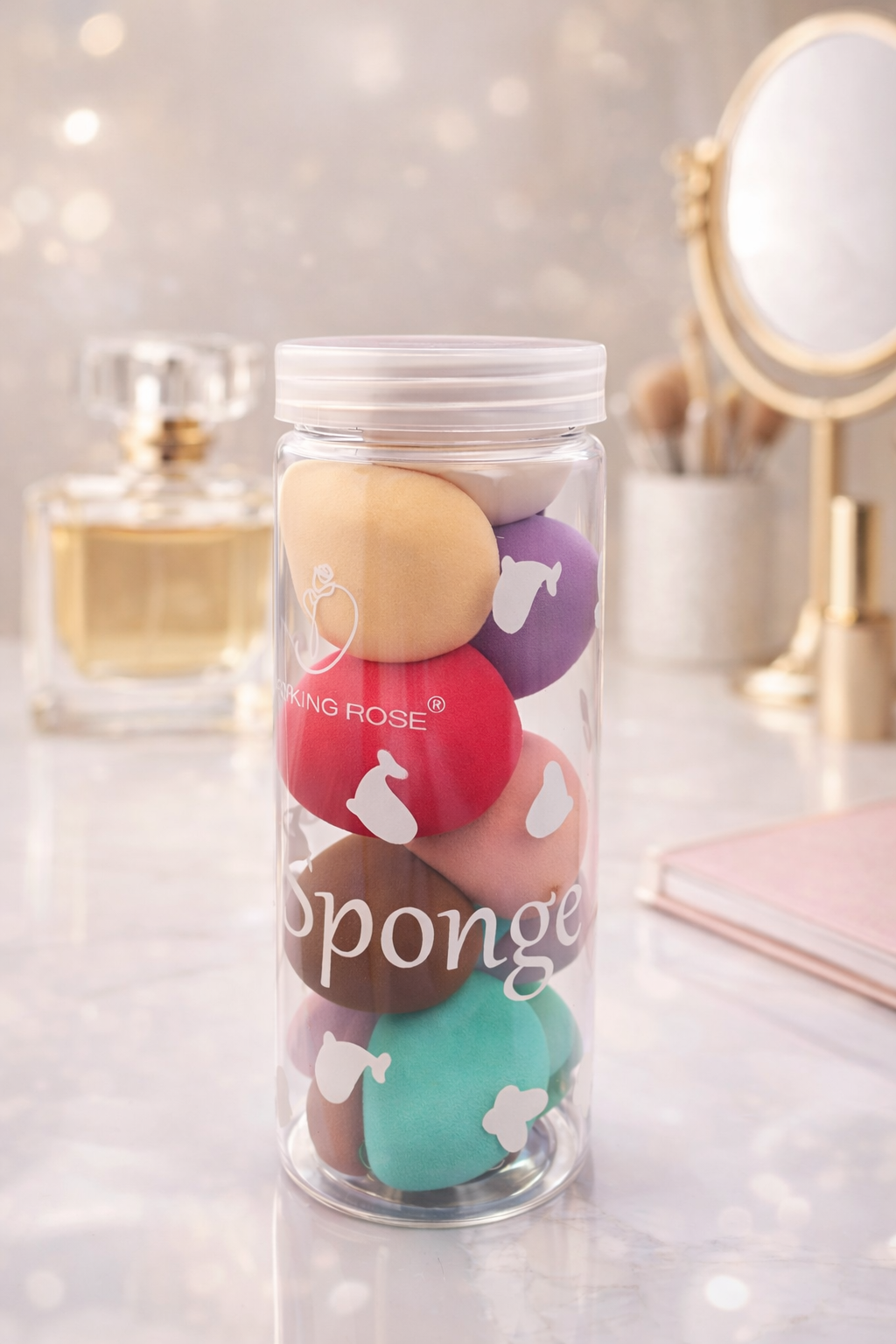 Set de 7 mini esponjas de maquillaje ideales para aplicar base, corrector y productos en crema con precisión.