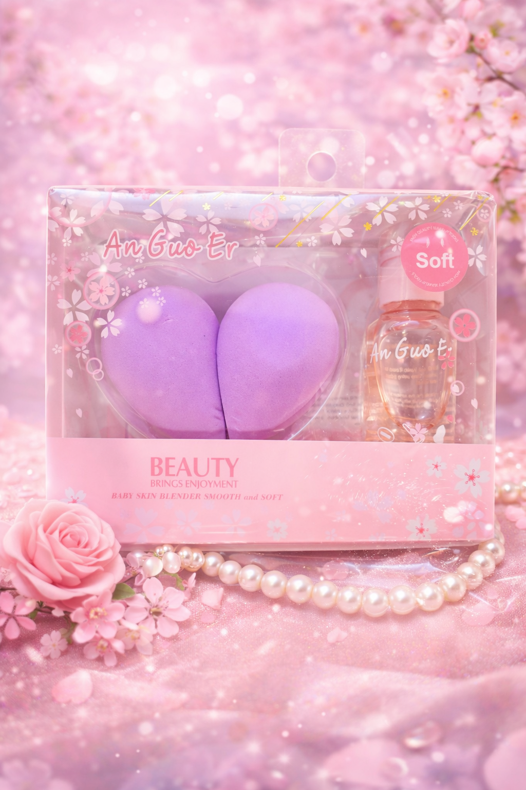 Este kit incluye 2 esponjas tipo beauty blender ultra suaves que permiten aplicar el maquillaje de forma uniforme, junto con un pequeño frasco de limpiador líquido para mantener tus esponjas siempre limpias e higiénicas.