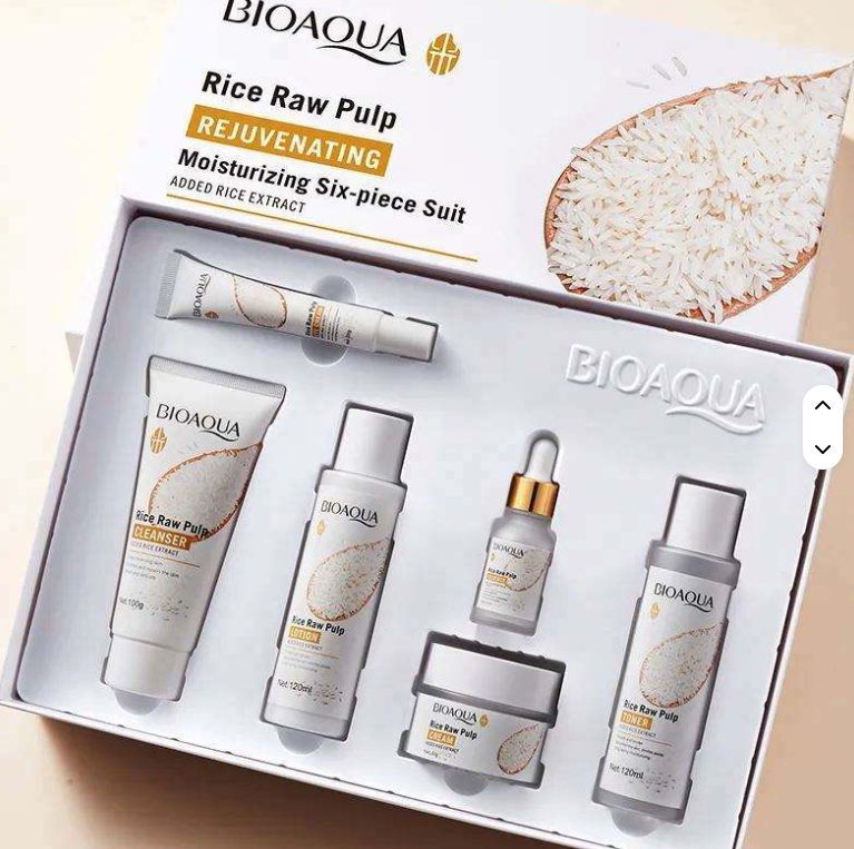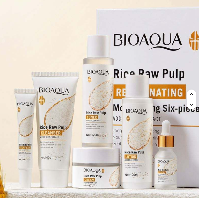 Este completo set facial Bioaqua Rice Raw Pulp incluye 6 productos esenciales para una rutina de cuidado de la piel eficaz: limpia, hidrata, nutre y revitaliza tu rostro en profundidad.